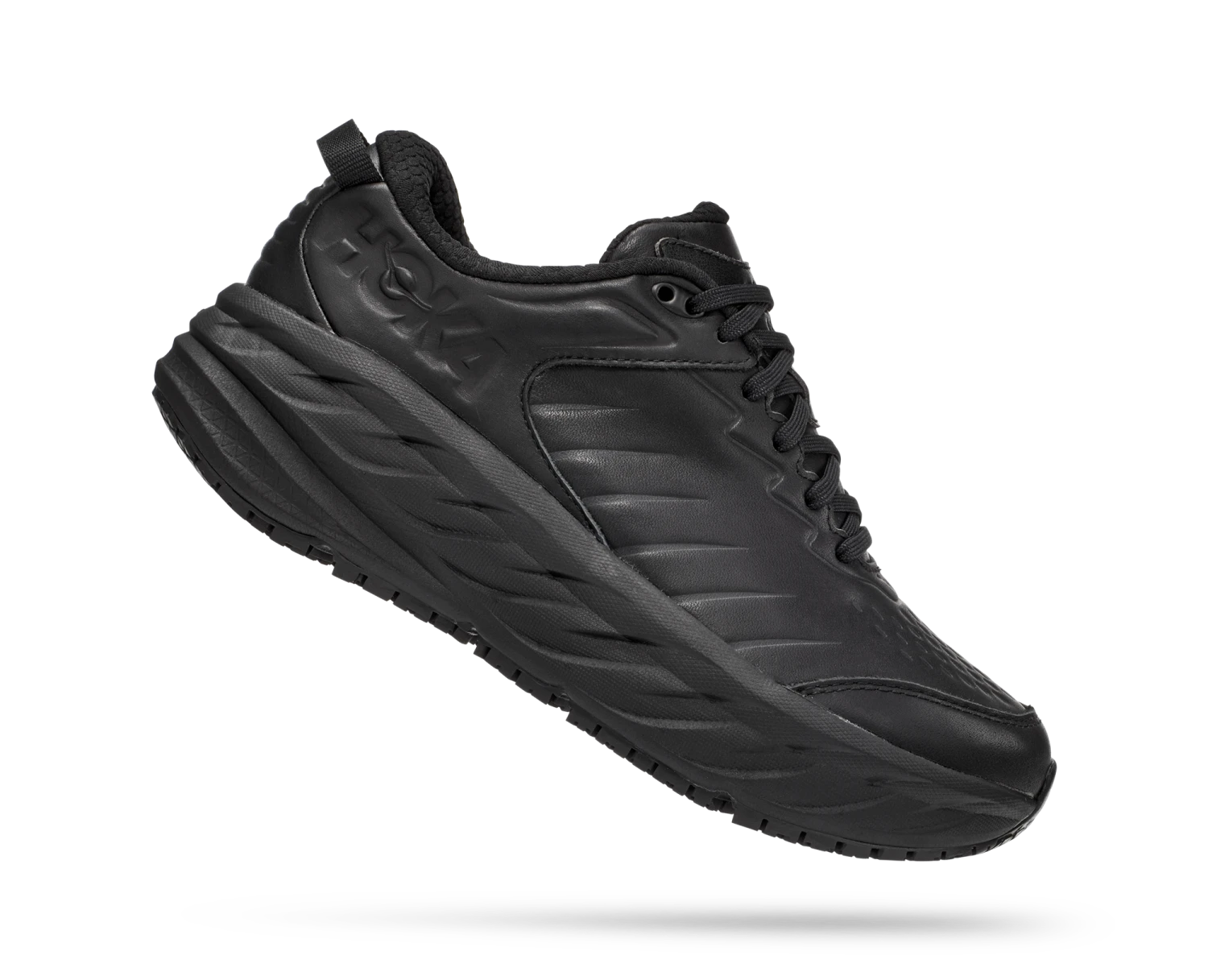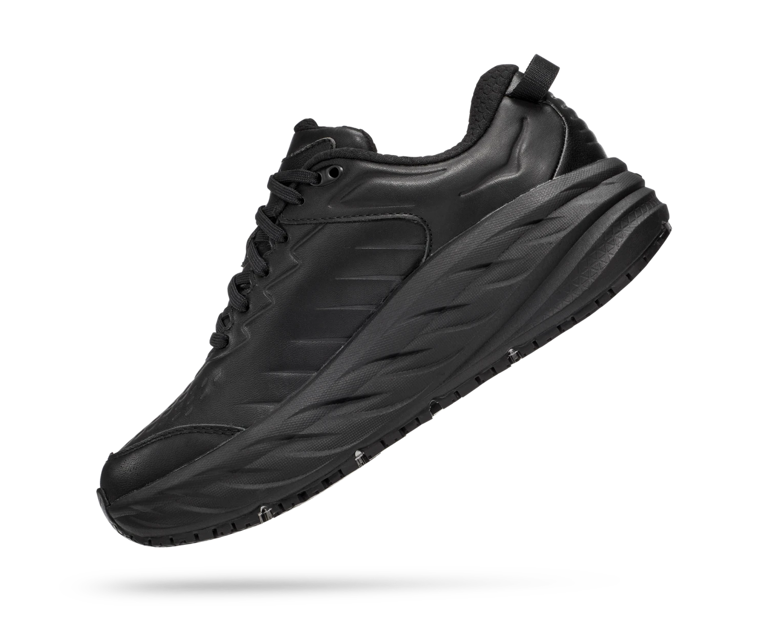 One of the first line extensions of the beloved Bondi family, the new Bondi SR takes the most cushioned shoe in the HOKA road-shoe lineup and reworks the silhouette to handle the demands of daily life. Engineered with an EVA midsole for plush, all-day cushioning, this workplace warrior has been updated with water-resistant leather and a slip-resistant outsole. Boasting a proprietary outsole compound tested against industry standards, the Bondi SR features an ultra-grippy, full ground contact rubber that stands up to the service industry and medical field alike.